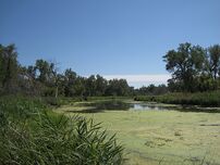 listen))[1][2][3] is a wetland, usually a swamp or shallow lake, often a backwater to a larger body of water.[4] Water tends to be stagnant or may flow slowly on a seasonal basis.[5]