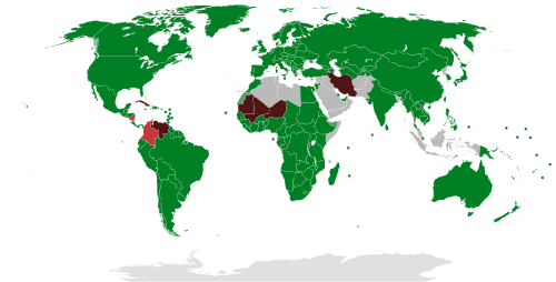 Despite the peace treaty between Israel and Egypt, Israel is still widely considered an enemy country among Egyptians.[427] Iran withdrew its recognition of Israel during the Islamic Revolution.[428] Israeli citizens may not visit Syria, Lebanon, Iraq, Saudi Arabia, and Yemen without permission from the Ministry of the Interior.[429] As a result of the 2008–09 Gaza War, Mauritania, Qatar, Bolivia, and Venezuela suspended political and economic ties with Israel,[430] though Bolivia renewed ties in 2019.[431]