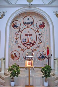 Mor Hananyo Monastery was the headquarters of the church from c. 1160 until 1932.[27] The patriarchate was transferred to Homs due to the Sayfo genocide and the effects of World War I. The current see of the church is the Cathedral of Saint George, Bab Tuma, Damascus, Syria, since 1959.[28][29][30] Since 2014, Ignatius Aphrem II is the current Patriarch of Antioch. The church has archdioceses and patriarchal vicariates in countries covering six continents. Being an active member of the World Council of Churches, the church participates in various ecumenical dialogues with other churches.[31][32]