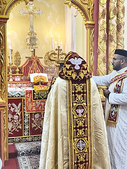 If the celebrant is a bishop, he wears a veil-mitre over the masnapso. Batrashil, or pallium, is worn over the phayno by bishops and corepiscopas wear a half cope over the phayno, like hamnikho worn by priests.[226] They carry a crosier stylised with serpents representing the staff of Moses during liturgy and in public.[221] They also carry a cross and scarf along with the crosier.[220]