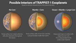 However, there are types of planets that are not seen in the Solar System, such as low-density "hot Jupiters", which are hotter and larger than the Solar System's gas giants.[14] Observers have also found many "super-Earths" or "sub-Neptunes", i.e. planets with a radius between that of Earth and Neptune,[15] whose radius is 4 times that of Earth. The existence of planet types not represented in the Solar System suggests the existence of planetary interiors that are likewise not represented in the Solar System. Some proposed interior types include tiny cores, massive mantles, and an ocean surface with no continents: or, a massive core and mantle, or perhaps there can be planets with an ice layer between its mantle and surface, both above a core.
