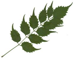 C. radicans is a vine that climbs on trees, other plants, or structures or trails along the ground and can grow to a length of up to 10 metres (33 feet). From the main vine, rigid or woody arching vines up to 2 metres (7 feet) long extend outward. The plant can form a dense groundcover or an aggressive liana covering plants or buildings. The leaves are opposite and odd-pinnately compound, meaning there is an odd number of leaflets, with one terminal leaflet. Leaves are up to 18 centimetres (7 inches) long with 7 to 13 leaflets that are each about 8 centimetres (3 inches) long and 4 centimetres (1.5 inches) wide. The leaflets are emerald green when new, maturing into a shiny dark green. They are ovate to broadly lanceolate and the edges are coarsely serrate.[7]