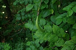Campsis radicans, the trumpet vine,[3] yellow trumpet vine,[4] or trumpet creeper[3] (also known in North America as cow itch vine[5] or hummingbird vine[6]), is a species of flowering plant in the trumpet vine family Bignoniaceae, native to eastern North America, and naturalized elsewhere. Growing to 10 metres (33 feet), it is a vigorous, deciduous woody vine, notable for its showy trumpet-shaped flowers. It inhabits woodlands and riverbanks, and is also a popular garden plant.