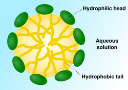 Wetting agent was used as soap for cleansing purposes for thousands of years. The oldest evidence of wetting solution went back to 2800 BC in ancient Babylon.[2] The earliest credible reference of soap is in the writings of Galen, the Greek physician, around 200 AD.[11] Over the following centuries, wetting solutions mainly functioned as detergents due to their wetting properties. Despite the extensive use of wetting solutions, the underlying chemical mechanism remained unknown until the emergence of McBain's proposed theory in 1913. Founded on his research on how the electrical conductivity of a solution of surfactant molecules changed with concentration, he raised the possibility of surfactant molecules in the form of self-assembled aggregates.[3] Not until Debye published his original hypothesis in 1949 did he described the reason of micelle formation and the existence of finite-shaped micelles.[12][13] McBain's discovery sparked numerous studies by Hobbs,[14] Ooshika,[15] Reich[16] and Halsey[17] from 1950 to 1956. These scholars intended to correct some of the foundational theories of the description of an equilibrium system, as well as emphasising the role of surface energy which was overlooked in Debye's prototype. In 1976, the fundamental theory for understanding the mechanism of micelle formation was developed by Tanford's free energy model.[18] Apart from integrating all relevant physicochemical elements and explaining the growth of micells, he provided a comprehensive reasoning of why micelles are finite in terms of opposing interactional forces.[19][20]