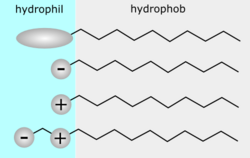 | Zwitterionic | more than one polar ionic head of opposite charges, the positively charged head group is mostly ammonium cation while the negative charge is carried by a carboxylate anion[5] | N-alkyl derivatives of amino acids like glycine and aminopropionic acid[24] | Alkyl betaine, phosphatidylcholine (lecithin) [24] |