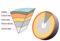 The first stage of a MS lesion is thought to be the development of an area called "normal appearing white matter" (NAWM).[19] In this area activated microglia appears, as shown by positron emission tomography. MS lesions appear in these areas as pre-active lesions without autoimmune infiltrates at this stage[20] They show microglia activation and degeneration of the neuron axons without T-cell infiltration. Both problems appear together though it is not known which one is first.[21]