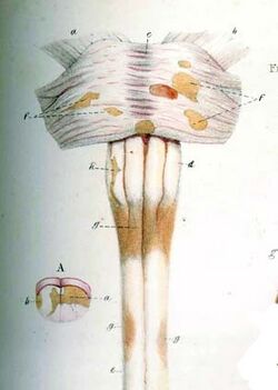 Detail of Carswell's drawing of MS lesions in the brain stem and spinal cord (1838)
