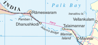 Ramsetu Bridge is a chain of limestone shoals, between Rameswaram and Mannar Island, off the northwestern coast of Sri Lanka. Geological evidence suggests that this bridge is a former land connection between India and Sri Lanka.[26] The bridge is 29 km (18 mi) long and separates the Gulf of Mannar (North-East) from the Palk Strait (South-West). It was reportedly passable on foot up to the 15th century until storms deepened the channel. The temple records record that Rama's Bridge was completely above sea level until it broke in a cyclone in 1480 CE.[27] The bridge was first mentioned in the ancient Indian Sanskrit epic Ramayana of Valmiki.[28] The name Rama's Bridge or Rama Setu (Sanskrit; setu: bridge) refers to the bridge built by the Vanara (ape men) army of Rama in Hindu mythology, which he used to reach Lanka and rescue his wife Sita from the demon king Ravana.[28] The Ramayana attributes the building of this bridge to Rama in verse 2-22-76, naming it as Setubandhanam.[29] The sea separating India and Sri Lanka is called Sethusamudram meaning "Sea of the Bridge". Maps prepared by a Dutch cartographer in 1747 CE, available at the Tanjore Saraswathi Mahal Library show this area as Ramancoil, a colloquial form of the Tamil Raman Kovil (or Rama's Temple).[30] Many other maps in Schwartzberg's historical atlas[31] and other sources such as travel texts by Marco Polo call this area by various names such as Adam's Bridge, Sethubandha and Sethubandha Rameswaram.[32]