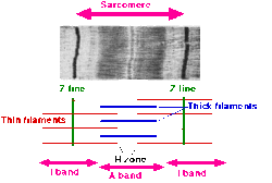 Skeletal muscle exhibits a distinctive banding pattern when viewed under the microscope due to the arrangement of two contractile proteins myosin, and actin – that are two of the myofilaments in the myofibrils. The myosin forms the thick filaments, and actin forms the thin filaments, and are arranged in repeating units called sarcomeres. The interaction of both proteins results in muscle contraction.