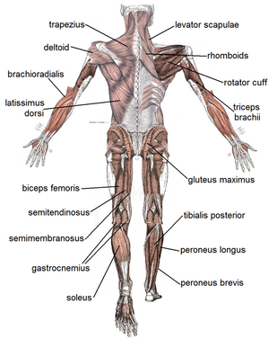 Skeletal muscles (commonly referred to as muscles) are organs of the vertebrate muscular system and typically are attached by tendons to bones of a skeleton.[1][2] The muscle cells of skeletal muscles are much longer than in the other types of muscle tissue, and are often known as muscle fibers.[3] The muscle tissue of a skeletal muscle is striated – having a striped appearance due to the arrangement of the sarcomeres.