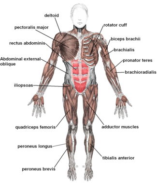 There are more than 600 skeletal muscles in the human body, making up around 40% of body weight in healthy young adults.[18][19][20] In Western populations, men have on average around 61% more skeletal muscle than women.[21] Most muscles occur in bilaterally-placed pairs to serve both sides of the body. Muscles are often classed as groups of muscles that work together to carry out an action. In the torso there are several major muscle groups including the pectoral, and abdominal muscles; intrinsic and extrinsic muscles are subdivisions of muscle groups in the hand, foot, tongue, and extraocular muscles of the eye. Muscles are also grouped into compartments including four groups in the arm, and the four groups in the leg.