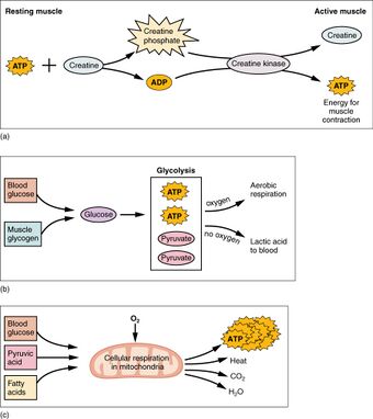Muscular activity accounts for much of the body's energy consumption. All muscle cells produce adenosine triphosphate (ATP) molecules which are used to power the movement of the myosin heads. Muscles have a short-term store of energy in the form of creatine phosphate which is generated from ATP and can regenerate ATP when needed with creatine kinase. Muscles also keep a storage form of glucose in the form of glycogen. Glycogen can be rapidly converted to glucose when energy is required for sustained, powerful contractions. Within the voluntary skeletal muscles, the glucose molecule can be metabolized anaerobically in a process called glycolysis which produces two ATP and two lactic acid molecules in the process (in aerobic conditions, lactate is not formed; instead pyruvate is formed and transmitted through the citric acid cycle). Muscle cells also contain globules of fat, which are used for energy during aerobic exercise. The aerobic energy systems take longer to produce the ATP and reach peak efficiency, and requires many more biochemical steps, but produces significantly more ATP than anaerobic glycolysis. Cardiac muscle on the other hand, can readily consume any of the three macronutrients (protein, glucose and fat) aerobically without a 'warm up' period and always extracts the maximum ATP yield from any molecule involved. The heart, liver and red blood cells will also consume lactic acid produced and excreted by skeletal muscles during exercise.