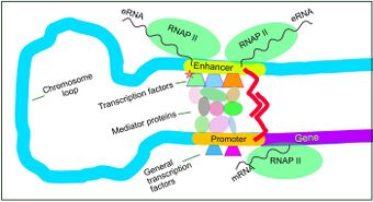 Gene expression in muscle is largely regulated, as in tissues generally, by regulatory DNA sequences, especially enhancers. Enhancers are non-coding sequences in the genome that activate the expression of distant target genes,[107] by looping around and interacting with the promoters of their target genes[108] (see Figure "Regulation of transcription in mammals"). As reported by Williams et al.,[102] the average distance in the loop between the connected enhancers and promoters of genes is 239,000 nucleotide bases.