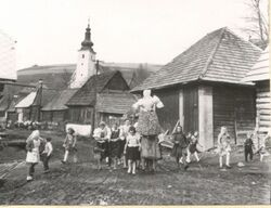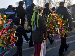 Walking with the Copse is a ritual in which pine branches, twigs or even entire small trees (pine or spruce) – adorned with ribbons, handmade ornaments, egg shells or flowers – are carried from house to house. In some variations of the ritual, a doll is tied to the top branch; in others, a local girl accompanies the copse (hence "walking with the Queen"). The copse is usually carried by girls, who walk from house to house, dance, sing and extend best wishes to the hosts. Some sources relate that the group also collected donations. Today the ritual often takes the form of bringing a decorated copse to the village after the ritual of drowning Marzanna is completed. This type of a two-part ritual (destroying the effigy and then returning with the copse) had been observed in the Opole region, the western parts of Kraków Voivodeship, Podhale, Slovakia, Moravia, Bohemia, Lusatia and Southern Germany (Thuringia, Franconia).[8] In the 19th century Oskar Kolberg noted that the copse had been carried around as a standalone custom (without the prior destruction of Marzanna) around Kraków and Sandomierz, as well as in the regions of Mazovia (on Easter Tuesday) and Lesser Poland (beginning of May or the Green week).[9]