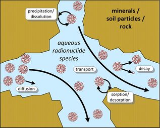 Often we are interested in how the moving groundwater will transport dissolved contaminants around (the sub-field of contaminant hydrogeology). The contaminants which are man-made (e.g., petroleum products, nitrate, Chromium or radionuclides) or naturally occurring (e.g., arsenic, salinity), can be transported through three main mechanisms, advection (transport along the main direction of flow at seepage velocity), diffusion (migration of the contaminant from high to low concentration areas), and dispersion (due to microscale heterogeneities present in the porous medium and non-uniform velocity distribution relative to seepage velocity).[10] Besides needing to understand where the groundwater is flowing, based on the other hydrologic properties discussed above, there are additional aquifer properties which affect how dissolved contaminants move with groundwater.