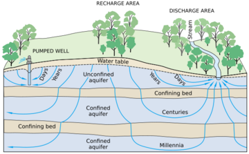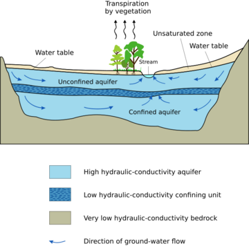 An aquifer is a collection of water underneath the surface, large enough to be useful in a spring or a well. Aquifers can be unconfined, where the top of the aquifer is defined by the water table, or confined, where the aquifer exists underneath a confining bed.[5]