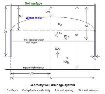 The Hooghoudt equation is a groundwater flow equation applied to subsurface drainage by pipes, tile drains or ditches.[14] An alternative subsurface drainage method is drainage by wells for which groundwater flow equations are also available.[15]