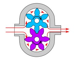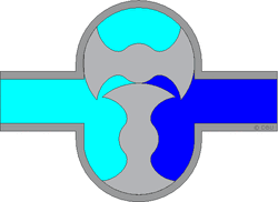 Named after the Roots brothers who invented it, this lobe pump displaces the fluid trapped between two long helical rotors, each fitted into the other when perpendicular at 90°, rotating inside a triangular shaped sealing line configuration, both at the point of suction and at the point of discharge. This design produces a continuous flow with equal volume and no vortex. It can work at low pulsation rates, and offers gentle performance that some applications require.