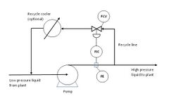 Most large pumps have a minimum flow requirement below which the pump may be damaged by overheating, impeller wear, vibration, seal failure, drive shaft damage or poor performance.[46] A minimum flow protection system ensures that the pump is not operated below the minimum flow rate. The system protects the pump even if it is shut-in or dead-headed, that is, if the discharge line is completely closed.[47] The simplest minimum flow system is a pipe running from the pump discharge line back to the suction line. This line is fitted with an orifice plate sized to allow the pump minimum flow to pass.[48] The arrangement ensures that the minimum flow is maintained, although it is wasteful as it recycles fluid even when the flow through the pump exceeds the minimum flow. A more sophisticated, but more costly, system (see diagram) comprises a flow measuring device (FE) in the pump discharge which provides a signal into a flow controller (FIC) which actuates a flow control valve (FCV) in the recycle line. If the measured flow exceeds the minimum flow then the FCV is closed. If the measured flow falls below the minimum flow the FCV opens to maintain the minimum flowrate.[49][46] As the fluids are recycled the kinetic energy of the pump increases the temperature of the fluid. For many pumps this added heat energy is dissipated through the pipework. However, for large industrial pumps, such as oil pipeline pumps, a recycle cooler is provided in the recycle line to cool the fluids to the normal suction temperature.[50] Alternatively the recycled fluids may be returned to upstream of the export cooler in an oil refinery, oil terminal, or offshore installation.