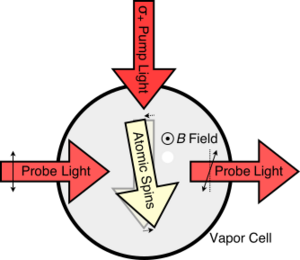 Alkali metal vapor of sufficient density is obtained by simply heating solid alkali metal inside the vapor cell. A typical SERF atomic magnetometer can take advantage of low noise diode lasers to polarize and monitor spin precession. Circularly polarized pumping light tuned to the [math]\displaystyle{ D_1 }[/math] spectral resonance line polarizes the atoms. An orthogonal probe beam detects the precession using optical rotation of linearly polarized light. In a typical SERF magnetometer, the spins merely tip by a very small angle because the precession frequency is slow compared to the relaxation rates.