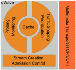 qWave is intended to ensure real-time transport of multimedia networks within a wireless network. qWave supports multiple simultaneous multimedia as well as data streams. qWave does not depend solely on bandwidth reservation schemes, as provided by RSVP for providing QoS guarantees, as the bandwidth in a wireless network fluctuates constantly. As a result, it also uses continuous bandwidth monitoring to implement service guarantees.[7]