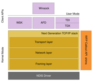 The Next Generation TCP/IP stack connects to NICs via a Network Driver Interface Specification (NDIS) driver. The network stack, implemented in tcpip.sys implements the Transport, Network and Data link layers of the TCP/IP model. The Transport layer includes implementations for TCP, UDP and unformatted RAW protocols. At the Network layer, IPv4 and IPv6 protocols are implemented in a dual-stack architecture. And the Data link layer (also called Framing layer) implements 802.3, 802.1, PPP, Loopback and tunnelling protocols. Each layer can accommodate Windows Filtering Platform (WFP) shims, which allows packets at that layer to be introspected and also host the WFP Callout API. The networking API is exposed via three components:[1]