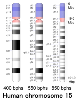 G-banding ideogram of human chromosome 15 in resolution 850 bphs. Band length in this diagram is proportional to base-pair length. This type of ideogram is generally used in genome browsers (e.g. Ensembl, UCSC Genome Browser).