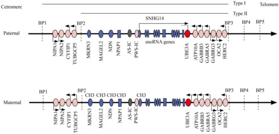 Paternal and maternal chromosome 15q11–13 regions around the Angelman syndrome imprinting center and Prader–Willi syndrome imprinting center are presented[11][12]