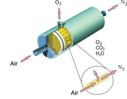 In the case of compressor technology, air is supplied into the fiber space under excess pressure, oxygen exits the membrane under slight excess pressure, and where necessary, is pressurized by booster compressor to the required pressure level. By the use of vacuum technology, a vacuum pump is used for the achievement of partial pressures difference.