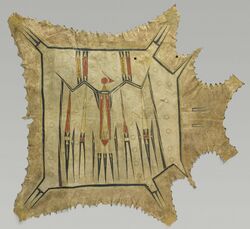 The Illinois, like many Native American groups, sustained themselves through agriculture, hunting, and fishing.[4] A partially nomadic group, the Illinois often lived in longhouses and wigwams, according to the season and resources that were available to them in the surrounding land. While the men usually hunted or participated in war, the women cultivated and processed their crops, created tools and clothing from game, and preserved food in various ways for storage and travel.[5] Not officially a Confederation, the villages were led by one Great Chief. The villages had several chiefs who led each individual clan.[6] The Illinois people eventually declined because of losses to infectious disease and war, mostly brought through the arrival of French colonists.[7][4]