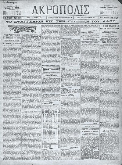 Akropolis, a daily broadsheet newspaper based in Athens, was essentially the creation of one man, Vlasis Gavriilidis, who founded it in 1883 and played a major part in running it until his death in 1920. By 1901 it had established a solid reputation as the most progressive of Greece's newspapers and one "of the few which cultivates a taste for general, non-political articles".[1]:126