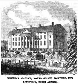 In June 1839, Charles Allison was encouraged by Wesleyan Methodist Minister Rev. John Bass Strong that a school of elementary and higher learning be built. Allison offered to purchase a site in Sackville to erect a suitable building for an academy and to contribute operating funds of £100 a year for 10 years. This offer was accepted and the Wesleyan Academy for boys subsequently opened in 1843.[10]