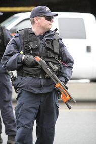 On the other hand, the shotgun has become a standard in law enforcement use. A variety of specialty less-lethal or non-lethal ammunitions, such as tear gas shells, bean bags, flares, explosive sonic stun rounds, and rubber projectiles, all packaged into 12-gauge shotgun shells, are produced specifically for the law enforcement market. Recently, Taser International introduced a self-contained electronic weapon which is fired from a standard 12-gauge shotgun.[38]