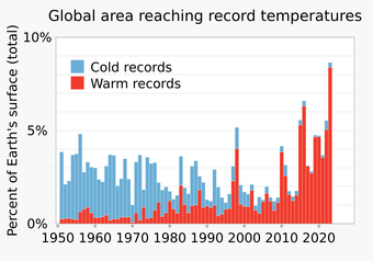 In recent decades, new high temperature records have substantially outpaced new low temperature records on a growing portion of Earth's surface.[58]