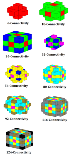 26-connected pixels are neighbors to every pixel that touches one of their faces, edges, or corners. These pixels are connected along either one, two, or all three of the primary axes. In addition to 18-connected pixels, each pixel with coordinates [math]\displaystyle{ \textstyle(x\pm1, y\pm1, z\pm1) }[/math], [math]\displaystyle{ \textstyle(x\pm1, y\pm1, z\mp1) }[/math], [math]\displaystyle{ \textstyle(x\pm1, y\mp1, z\pm1) }[/math], or [math]\displaystyle{ \textstyle(x\mp1, y\pm1, z\pm1) }[/math] is connected to the pixel at [math]\displaystyle{ \textstyle(x, y, z) }[/math].
