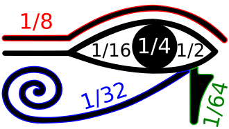 The Eye of Horus is not only a depiction of the god Horus (oudjat), but it was also a precise layout of the ratio of rational numbers, as 1/2 + 1/4 + 1/8 + 1/16 + 1/32 + 1/64.