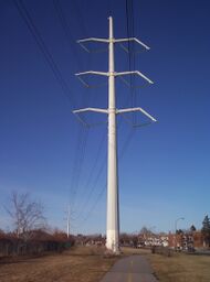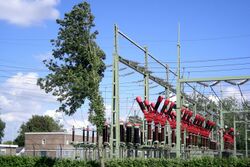 Electric power distribution is the final stage in the delivery of electric power; it carries electricity from the transmission system to individual consumers. Distribution substations connect to the transmission system and lower the transmission voltage to medium voltage ranging between 2 kV and 35 kV with the use of transformers.[11] Primary distribution lines carry this medium voltage power to distribution transformers located near the customer's premises. Distribution transformers again lower the voltage to the utilization voltage used by lighting, industrial equipment or household appliances. Often several customers are supplied from one transformer through secondary distribution lines. Commercial and residential customers are connected to the secondary distribution lines through service drops. Customers demanding a much larger amount of power may be connected directly to the primary distribution level or the subtransmission level.[12]