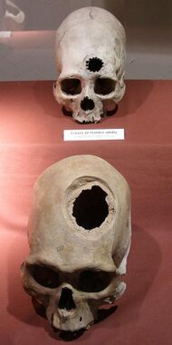 The Incas appear to have practiced trepanning since the late Stone Age,[1] a method that is compared to similar techniques used today.[2] These procedures were mostly performed on combatants, with evidence from skeletal remains revealing that the earliest methods usually resulted in death.[2] However, by the 1400s, Incas proved to be "skilled surgeons", as survival rates rose to about 90%, infection rates following the procedure were low and evidence was found showing that some individuals survived the surgery on multiple occasions.[2] Incan surgeons learned to avoid areas of the head that would cause injury, using a scraping method on the skull that would cause less trauma.[2] They also likely used medicinal herbs of the time, such as coca and alcohol for pain while balsam and saponin would be employed for antibiotic purposes.[2]