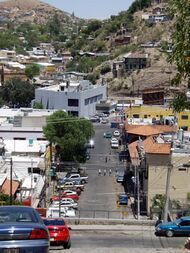 Sonora's border with Arizona has received more attention since 2000, with the increase of illegal border crossings and drug smuggling, especially in rural areas such as around Naco, which is one of the main routes into the United States.[63] Starting in the 1990s, increased border patrols and the construction of corrugated metal and chain link fences in California and Texas dramatically cut illegal border crossing in these two states. This led illegal immigrants into the more dangerous desert areas of Arizona and New Mexico, which have mostly seen rises in illegal crossings since then.[64][65] Many migrants now come to the Arizona border between Agua Prieta and Nogales, with Naco as one of the preferred routes for "coyotes" (also called "polleros" or "enganchadores") or smugglers who offer to take migrants across.[63][66] Migrant shelters and hotel in border towns cater to those waiting to cross into Arizona.[67] Providing lodging for migrants is a growing business in Naco and other border towns, where the rate is between 200 and 300 pesos per night per person. Many of these lodgings are filled with people who cannot cross the border.[66] One example is the Hospedaje Santa María, which is a run-down, two-story building.[65]