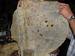 Tortillas are the base of the diet, but they are made from wheat, rather than corn. In Sonora, these tortillas are much larger than those prepared elsewhere and paper thin. Dairy products are common in dishes with chile peppers playing a smaller role.[174] However, one important native chile pepper is the chiltepín (Capsicum annuum var. aviculare), which people continue to harvest wild in the mountains of northwestern Mexico. In a dry year, about 20 tonnes (44,000 lb) can be harvested in Sonora, with as much as 50 tonnes (110,000 lb) during a wet year.[176]
