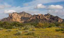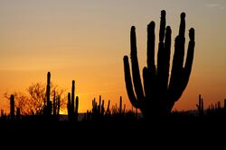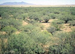 Habitats and vegetation vary greatly depending on elevation and rainfall.[81] An estimated 2,230,000 hectares (22,300 km2; 8,600 sq mi) of Sonora is in arid grasslands; 1,200,000 hectares (12,000 km2; 4,600 sq mi) are covered in forests, 301,859 hectares (3,018.59 km2; 1,165.48 sq mi) in rainforest and 1,088,541 hectares (10,885.41 km2; 4,202.88 sq mi) in farmland. Seventy percent of the territory, or 13,500,000 hectares (135,000 km2; 52,000 sq mi), is covered in desert vegetation or arid grasslands.[38] The Yécora municipality in eastern Sonora has one of the highest grass diversities in Mexico.[82] There are eight types of desert vegetation, seven of which are native to the Sonoran Desert and one in the area that transitions to the Chihuahua Desert. Most are scrubs or small bushes, which generally do not reach over 4 metres (13 ft) in height, most of the rest are cactus, with some mangroves and other halophile plants.[38] Many plants are rainfall sensitive, with most trees and shrubs growing leaves and flowers just before or during the rainy season, then drop their leaves afterwards. However, there are plants in flower at one time or another throughout the year.[83] Coastal plants receive less water stress due to lower evaporation rates, and substantial moisture from dew, especially in the cooler months.[84]