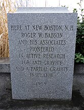 Babson appears to have declared all-out war on gravity around 1947, when his grandson also died of drowning.[1] He decided to found the Gravity Research Foundation to investigate the possibility of anti-gravity shielding. It would collect and collate research and provide funding for promising ideas. The institute was established in 1948 at New Boston, New Hampshire, 60 miles north of Boston. He chose the location for its remoteness, reasoning it would be safe in the event of a nuclear war.[4]
