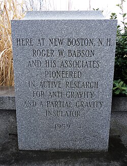 The Gravity Research Foundation was a quasi-scientific institute established in New Boston, New Hampshire in 1948 by the entrepreneur Roger Babson (1875-1967) with the purpose of pursuing anti-gravity research into gravity shielding and other pseudoscientific topics. It never had a large staff, but organized conferences and gave grants and large stone objects. Babson believed that if his institute could discover a material capable of shielding from gravity, it would prevent airplane crashes, drownings, and people injuring themselves in falls, while providing free energy.