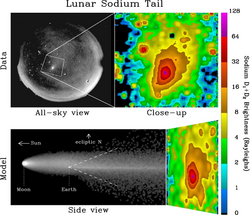 The Moon has an atmosphere consisting of only an exosphere,[93] which is so tenuous as to be nearly vacuum, with a total mass of less than 10 tonnes (9.8 long tons; 11 short tons).[94] The surface pressure of this small mass is around 3 × 10−15 atm (0.3 nPa); it varies with the lunar day. Its sources include outgassing and sputtering, a product of the bombardment of lunar soil by solar wind ions.[16][95] Elements that have been detected include sodium and potassium, produced by sputtering (also found in the atmospheres of Mercury and Io); helium-4 and neon[96] from the solar wind; and argon-40, radon-222, and polonium-210, outgassed after their creation by radioactive decay within the crust and mantle.[97][98] The absence of such neutral species (atoms or molecules) as oxygen, nitrogen, carbon, hydrogen and magnesium, which are present in the regolith, is not understood.[97] Water vapor has been detected by Chandrayaan-1 and found to vary with latitude, with a maximum at ~60–70 degrees; it is possibly generated from the sublimation of water ice in the regolith.[99] These gases either return into the regolith because of the Moon's gravity or are lost to space, either through solar radiation pressure or, if they are ionized, by being swept away by the solar wind's magnetic field.[97]