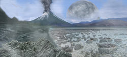 Isotope dating of lunar samples suggests the Moon formed around 50 million years after the origin of the Solar System.[32][33] Historically, several formation mechanisms have been proposed,[34] but none satisfactorily explains the features of the Earth–Moon system. A fission of the Moon from Earth's crust through centrifugal force[35] would require too great an initial rotation rate of Earth.[36] Gravitational capture of a pre-formed Moon[37] depends on an unfeasibly extended atmosphere of Earth to dissipate the energy of the passing Moon.[36] A co-formation of Earth and the Moon together in the primordial accretion disk does not explain the depletion of metals in the Moon.[36] None of these hypotheses can account for the high angular momentum of the Earth–Moon system.[38]