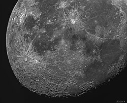 The Moon's diameter is about 3,500 km, more than one-quarter of Earth's, with the face of the Moon comparable to the width of either mainland Australia,[67] Europe or the contiguous United States.[68] The whole surface area of the Moon is about 38 million square kilometers, comparable to that of the Americas.[69]