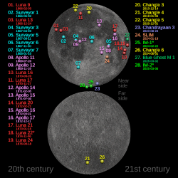 The next years saw a row of first missions to the Moon by a new group of states actively exploring the Moon. Between 2004 and 2006 the first spacecraft by the European Space Agency (ESA) (SMART-1) reached the Moon, recording the first detailed survey of chemical elements on the lunar surface.[274] The Chinese Lunar Exploration Program reached the Moon for the first time with the orbiter Chang'e 1 (2007–2009),[275] obtaining a full image map of the Moon. India reached, orbited and impacted the Moon in 2008 for the first time with its Chandrayaan-1 and Moon Impact Probe, becoming the fifth and sixth state to do so, creating a high-resolution chemical, mineralogical and photo-geological map of the lunar surface, and confirming the presence of water molecules in lunar soil.[276]