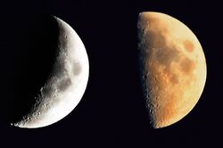 The apparent orientation of the Moon depends on its position in the sky and the hemisphere of the Earth from which it is being viewed. In the Northern Hemisphere it appears upside down compared to the view from the Southern Hemisphere.[206] Sometimes the "horns" of a crescent moon appear to be pointing more upwards than sideways. This phenomenon is called a wet moon and occurs more frequently in the tropics.[207]