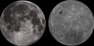 The Moon is by size and mass the fifth largest natural satellite of the Solar System, categorizable as one of its planetary-mass moons, making it a satellite planet under the geophysical definitions of the term.[17] It is smaller than Mercury but considerably larger than the largest dwarf planet of the Solar System, Pluto. The Moon is the largest natural satellite in the Solar System relative to its primary planet.[lower-alpha 7][lower-alpha 8][66]
