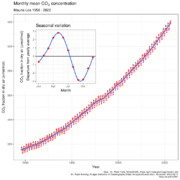 2 from the Mauna Loa Observatory show that concentrations have increased from about 313 parts per million (ppm)[37] in 1960, passing the 400 ppm milestone in 2013.[38] The current observed amount of CO